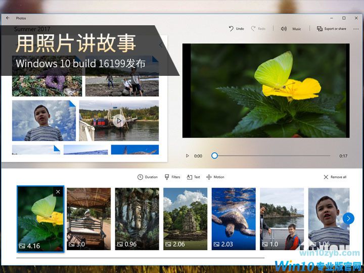 Windows 10 Insider Preview Build 16199版发布了,该版本将照片"故事"功能全面带到用户面前,简单操作即可将一系列照片、视频和音乐混合一本多媒体故事。