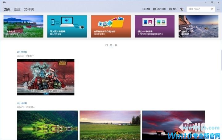 关于新照片的故事功能,最先是从上一个版本Build 16193开始在小部分Insider预览体验项目成员中进行了测试,待16199版发布后才开始向其余的Insider成员推送。打开更新后的照片应用会发现有不小的改变:首先是应用上方增加了一条快捷功能栏(暂时被称作Discovery bar),通过它可以快捷的创建新故事以及连接移动设备导入照片等常用功能。