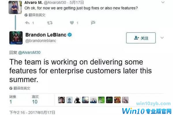 微软的Brandon LeBlanc在推文中表示,事实上未来将会推出诸多新功能,但是主要是面向企业用户的。目前尚不清楚LeBlanc的“features for enterprise customers”(针对企业用户的功能)所代表含义,是Windows 10 Mobile Enterprise SKU,还是这些新功能面向所有人开放,但是主要面向企业市场。