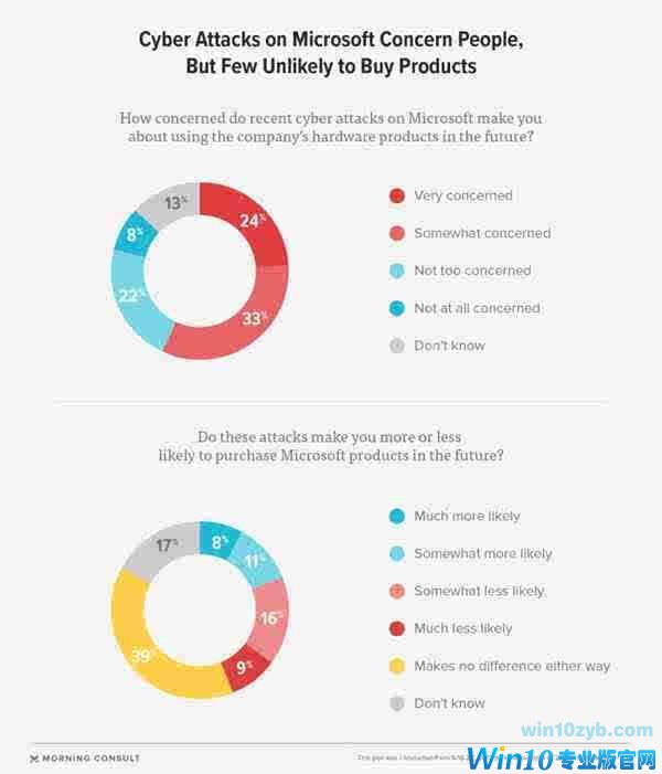 调查结果显示57%的用户对于未来继续使用微软软硬件产品表示担忧; 39%的用户表示将会网络攻击并不会影响今后他们购买微软的产品;19%的人表示今后更愿意选购微软的产品。