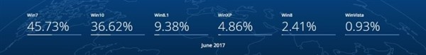 先看NetMarketShare,对比5月,Win7的份额从49.46%减少到49.04%,同时Win10用户回流,但奇怪的是,XP用户同样小幅攀升,看来勒索病毒并没有让很多用户原理。