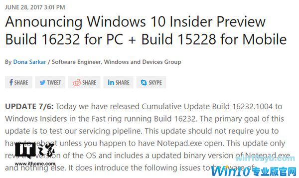 7月7日消息 今天微软唐娜姐更新博客称,在Win10秋季创意者更新预览版16232基础之上,推送了最新的Win10 Build 16232.1004更新。本次更新的目的主要是测试推送服务管线,本次更新不要重启电脑,除非是你已经打开了笔记本程序。因为除了更新系统版本外,还升级了二进制版记事本。