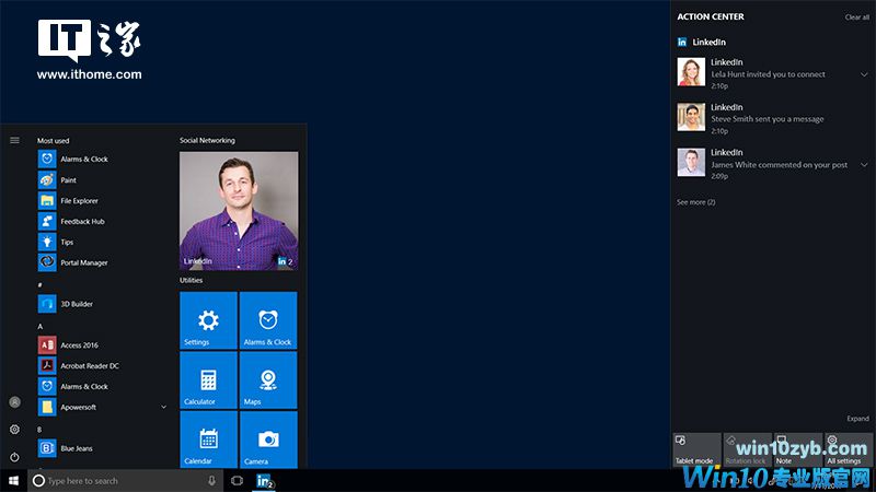 Windows10的Linkedin应用程序提供了更引人入胜和完全集成的 Linkedin体验,允许用户从“开始”菜单和任务栏快速访问。在Action Center和动态磁贴中,该应用程序还能提供实时通知,包括新邮件、下一个会议安排、行业趋势新闻以及网络及时更新等。