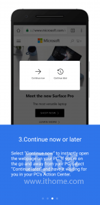 当你完成链接之后,你在手机上首次使用该功能会被带到我们的微软账号登录页面,在登陆之后,用户就可以点击分享按钮,并且选择是马上在PC上继续阅读还是稍后阅读。马上阅读会使用户的PC马上打开该内容,选择稍后阅读的话,该内容会出现在用户的通知中心中。