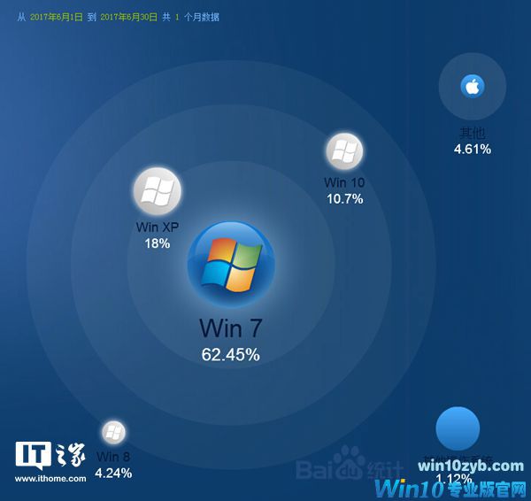 从百度统计流量研究院提供的数据显示,从今年6月1日到6月30日,在国内操作系统市场上,发布八年的Windows 7的份额依然高达62.45%,同期Win10操作系统在中国的市场份额为10.7%,甚至在占有率上没有赶上Windows XP的18%。