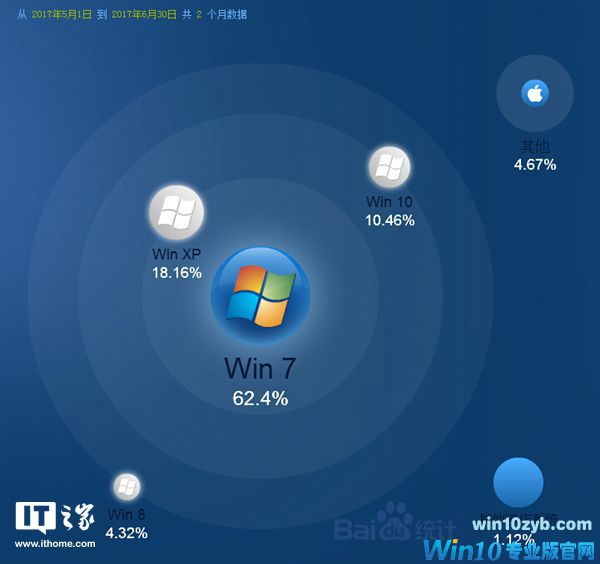 百度统计的此项数据来自于百度流量研究院所覆盖的超过150万的站点,而不是baidu.com的流量数据,因此有一定的参考性,从整体来看,在国内Win10想要赶超Win7还是任重道远。