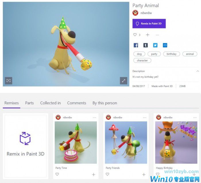 首先是一个名为“Remixes”的新功能,可以让人们快速找到基于所选3D项目的衍生作品。该功能作为3D查看器下的新标签存在,可以查看项目库,或者开始在Paint 3D应用程序中进行自己的混搭。