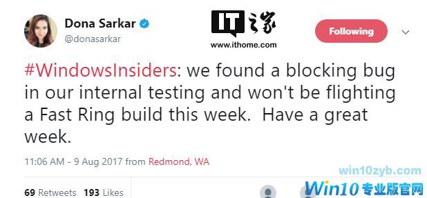 微软唐娜姐在Twitter上公布了本次Win10预览版推迟的原因:内测版遇到了阻断性Bug。